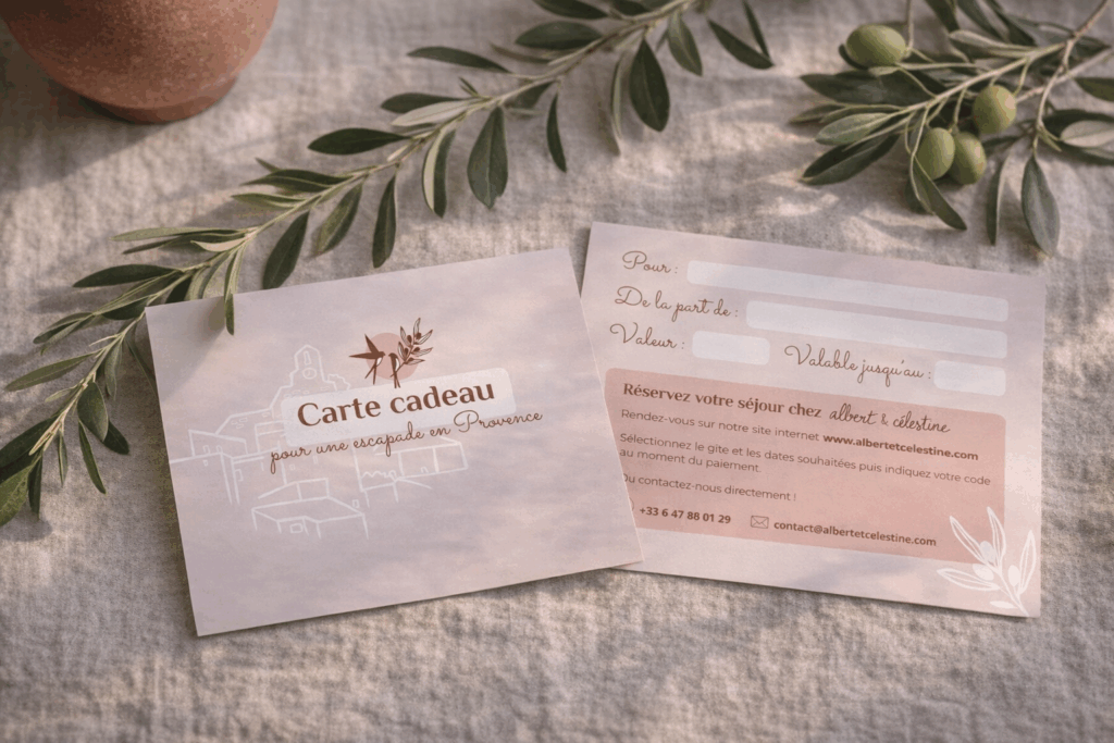 Envie d’un cadeau qui ne se range pas dans un placard, mais dans la mémoire ? Avec notre carte cadeau, offrez une expérience à vivre, que ce soit pour Noël, pour un anniversaire ou simplement pour faire plaisir. Un réveil face aux toits provençaux, un plongeon dans la piscine ou une soirée d’été qui s’étire… comme une invitation à ralentir et à profiter de l’instant pour se créer de précieux souvenirs.
