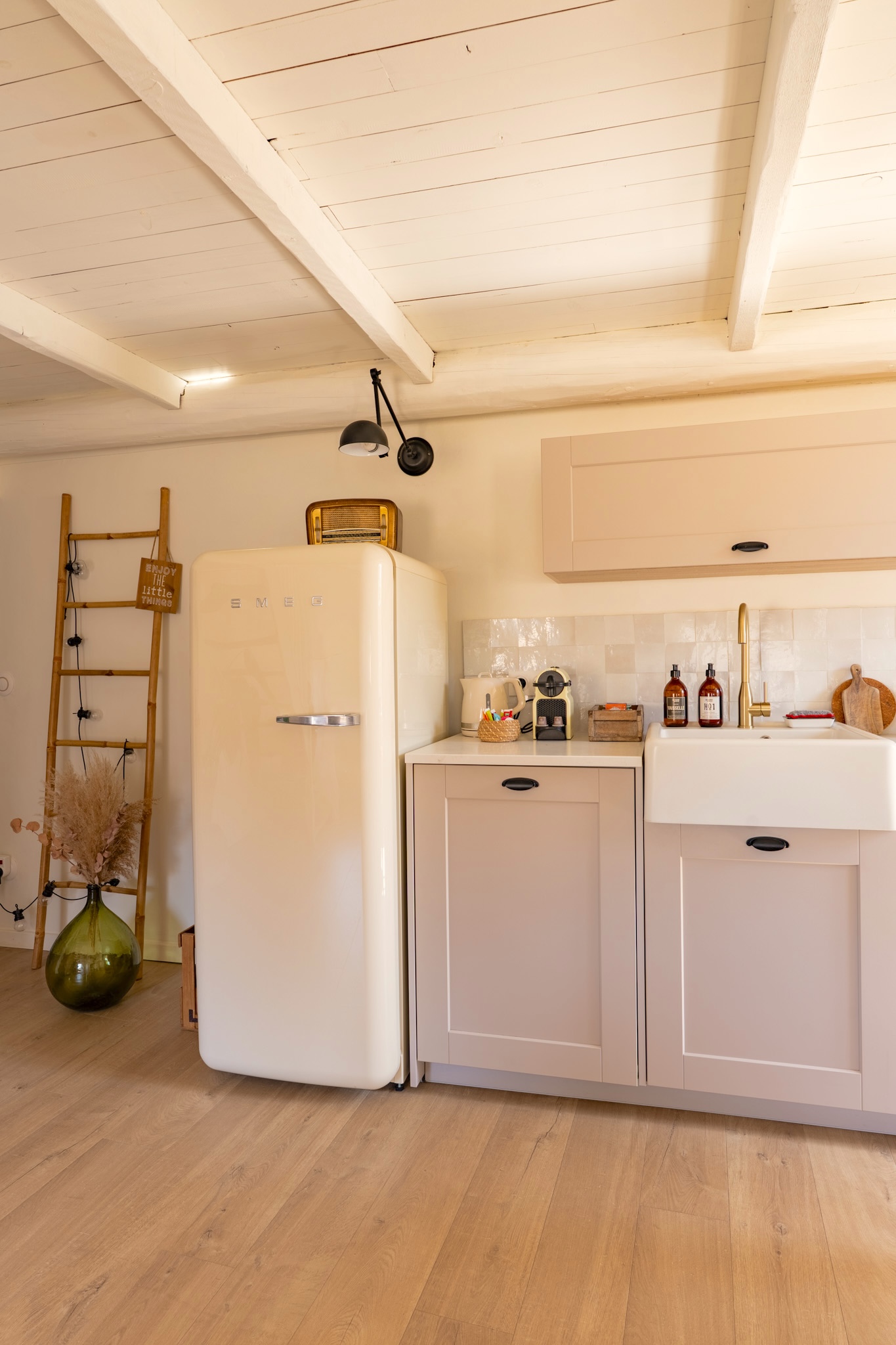 À l’étage, l’espace détente en mezzanine s’ouvre sur la salle de bain avec douche et wc.
